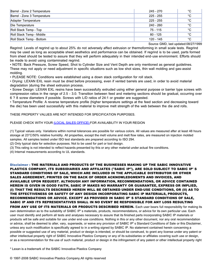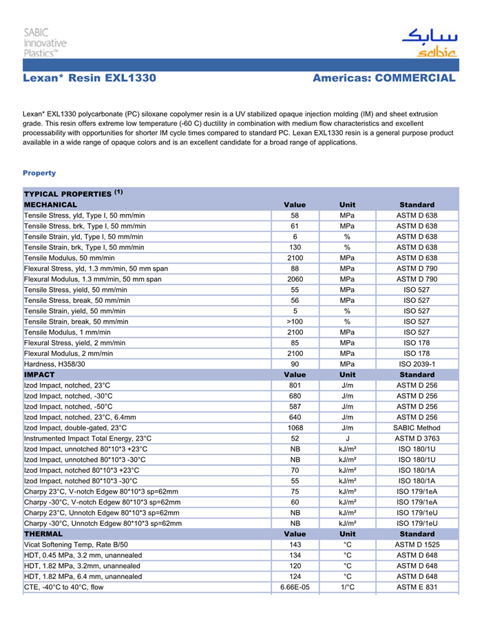 Lexan* EXL1330 polycarbonate (PC) siloxane copolymer resin is a UV stabilized opaque injection molding (IM) and sheet extrusion grade. This resin offers extreme low temperature (-60 C) ductility in combination with medium flow characteristics and excellent processability with opportunities for shorter IM cycle times compared to standard PC. Lexan EXL1330 resin is a general purpose product available in a wide range of opaque colors and is an excellent candidate for a broad range of applications.