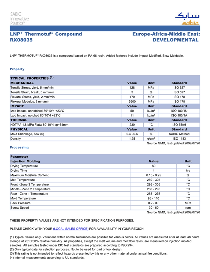 应用范围: 产品描述 LNP THERMOTUF RX08035物性表 LNP* THERMOTUF* RX08035 is a compound based on PA 66 resin. Added features include Impact Modified, Blow Moldable.