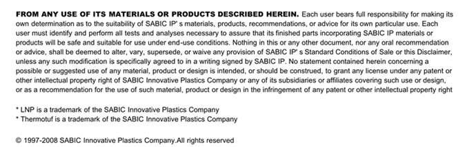 应用范围: 产品描述 LNP Thermotuf VF003物性表 “LNP THERMOTUF VF003是一种聚酰胺66(尼龙66)材料,含有的填充物为玻璃纤维增强材料。 LNP THERMOTUF VF003的主要特性为:耐冲击。” LNP* THERMOTUF* VF003 is a compound based on Nylon resin containing Glass Fiber.