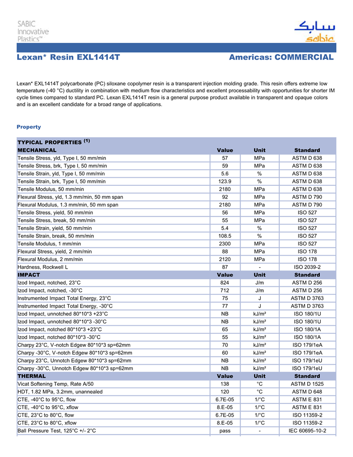 Lexan* EXL1414T polycarbonate (PC) siloxane copolymer resin is a transparent injection molding grade. This resin offers extreme low temperature (-40 °C) ductility in combination with medium flow characteristics and excellent processability with opportunities for shorter IM cycle times compared to standard PC. Lexan EXL1414T resin is a general purpose product available in transparent and opaque colors and is an excellent candidate for a broad range of applications.