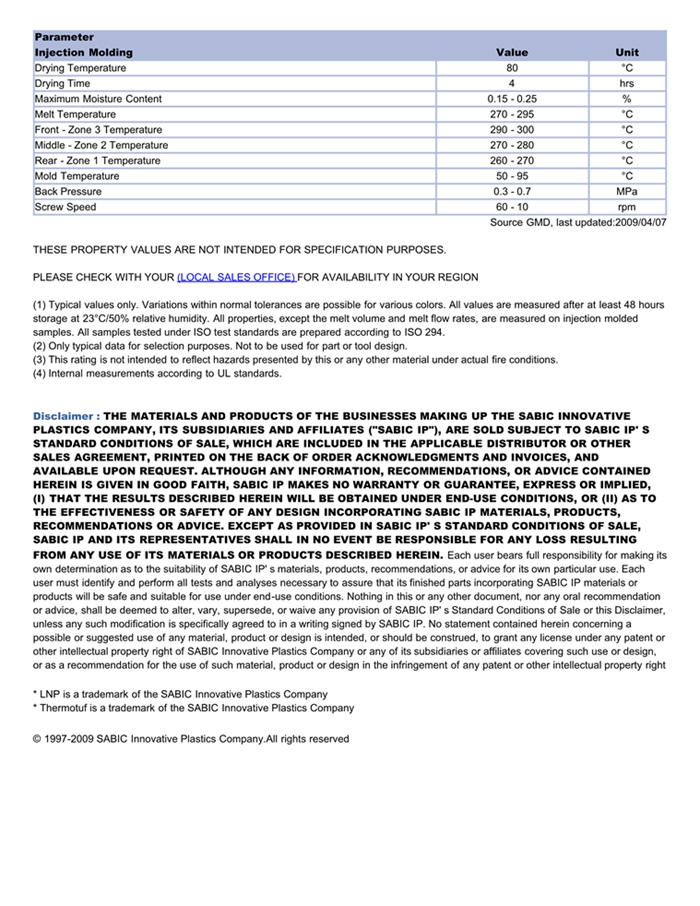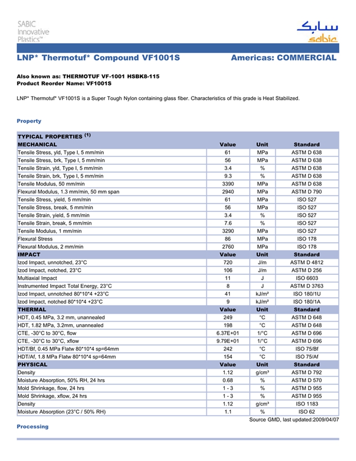 应用范围: 产品描述 LNP THERMOTUF VF1001S物性表 LNP THERMOTUF VF1001S是一种聚酰胺产品,含有的填充物为5.0%玻璃纤维增强材料,可以通过注射成型进行加工。 特性包括: 良好的韧性 耐冲击 热稳定剂