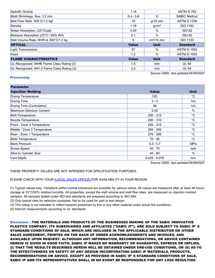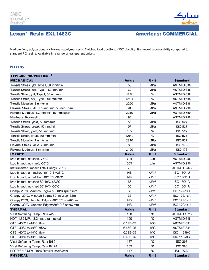 应用范围:产品描述LEXAN PC EXL1463C物性表Medium flow, polycarbonate siloxane copolymer resin. Notched izod ductile to -30C ductility. Enhanced processability compared to standard PC resins. Available in a range of tra