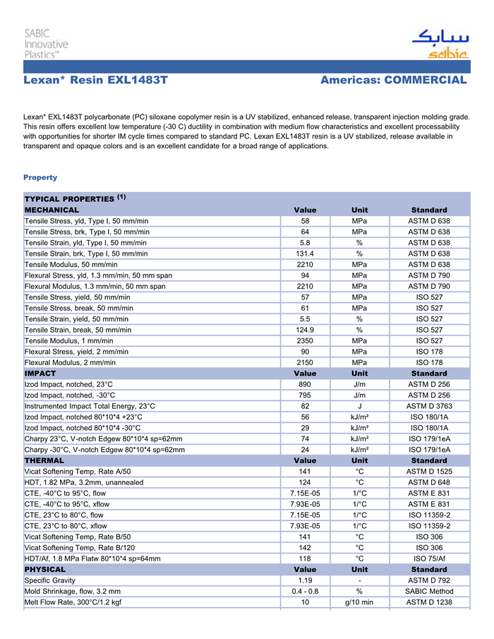 Lexan* EXL1483T polycarbonate (PC) siloxane copolymer resin is a UV stabilized, enhanced release, transparent injection molding grade. This resin offers excellent low temperature (-30 C) ductility in combination with medium flow characteristics and excellent processability with opportunities for shorter IM cycle times compared to standard PC. Lexan EXL1483T resin is a UV stabilized, release available in transparent and opaque colors and is an excellent candidate for a broad range of applications.