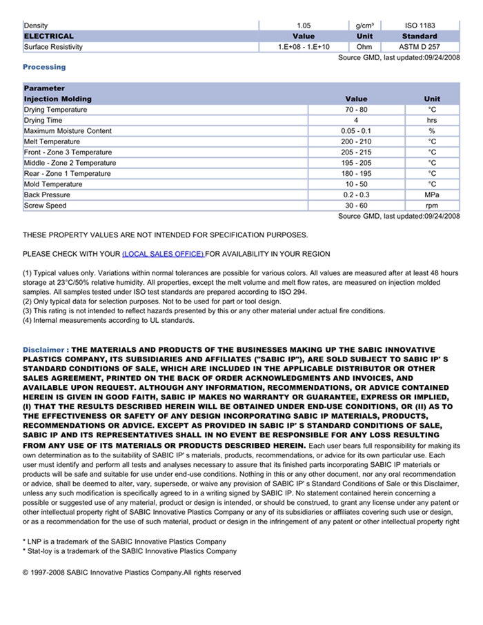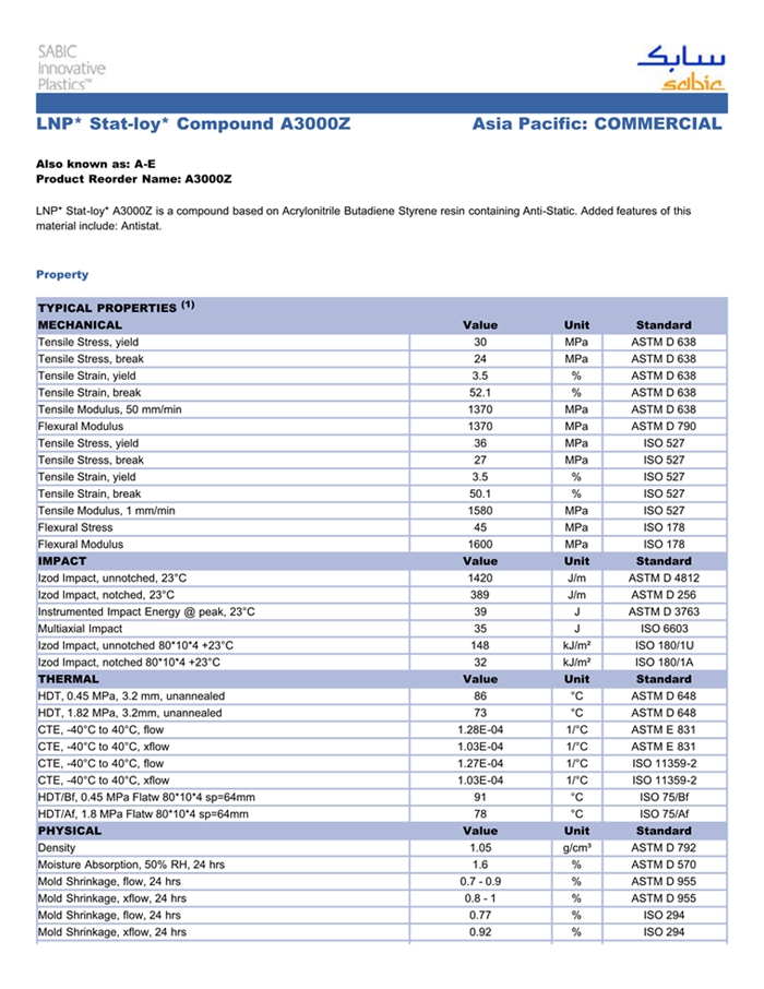 应用范围:产品描述LNP STATLOY A3000Z物性表LNP* Stat-loy* A3000Z is a compound based on Acrylonitrile Butadiene Styrene resin containing Anti-Static. Added features of this material include: Antistat.
