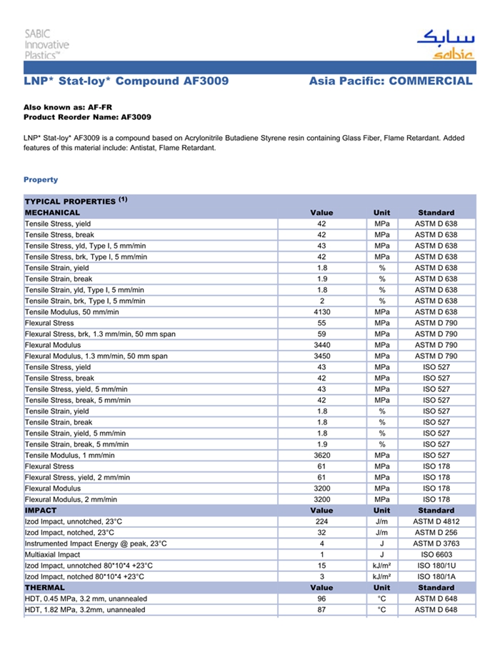 应用范围: 产品描述 LNP Statloy AF3009物性表 “LNP STAT-LOY AF3009是一种丙烯腈丁二烯苯乙烯(ABS)产品,含有的填充物为10%玻璃纤维增强材料,以通过注射成型进行加工。 特性包括: 阻燃/额定火焰 Flame Retardant 抗静电” LNP* Stat-loy* AF3009 is a compound based on Acrylonitril