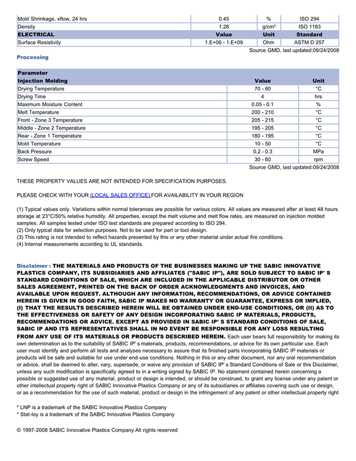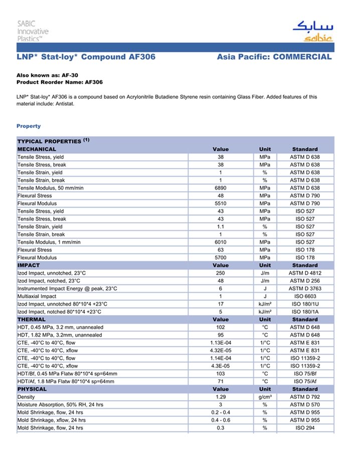 应用范围: 产品描述 LNP Statloy AF306物性表 “LNP STAT-LOY AF306是一种丙烯腈丁二烯苯乙烯(ABS)材料,含有的填充物为玻璃纤维增强材料,加工方式为:注射成型。 LNP STAT-LOY AF306的主要特性为:抗静电。” LNP* Stat-loy* AF306 is a compound based on Acrylonitrile Butadiene St