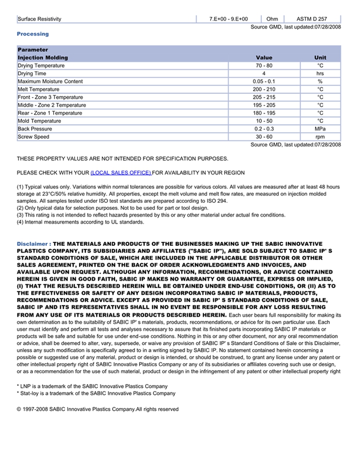应用范围:产品描述LNP STATLOY AX06484X物性表LNP* Stat-Loy* AX06484 is a compound based on ABS resin containing mineral filler. Characteristics of this grade is it is extrudeable and static dissipative.
