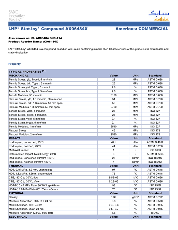 LNP* Stat-Loy* AX06484 is a compound based on ABS resin containing mineral filler. Characteristics of this grade is it is extrudeable and static dissipative.