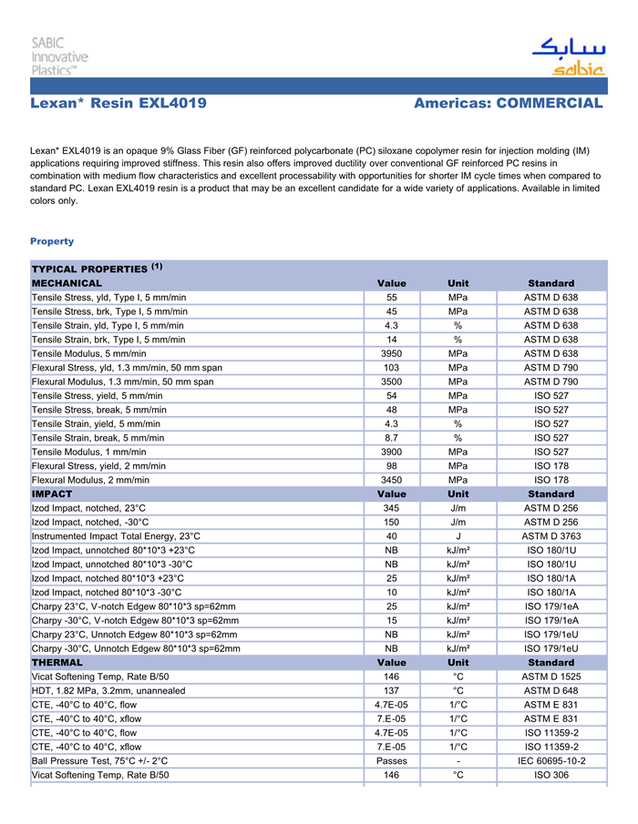 “Lexan EXL4019 resin是一种聚碳酸酯(PC)产品,含有的填充物为9.0% 玻璃纤维增强材料。它可以通过注射成型进行加工。