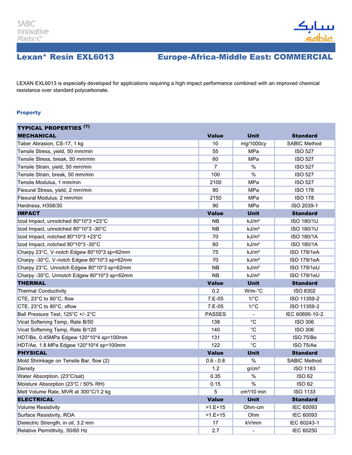 应用范围:产品描述Lexan PC EXL6013物性表“Lexan EXL6013 resin是一种聚碳酸酯(PC)材料,。 该产品在欧洲有供货,加工方式为:注射成型。主要特性有:阻燃/额定火焰通过 ROHS 认证耐冲击耐化学品”。相关颜色色号:EXL6013-18213LEXAN EXL6013 is especially developed for applications requiring a h