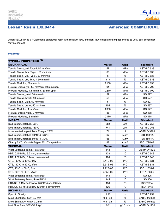 Lexan EXL8414 resin是一种聚碳酸酯(PC)产品,。它可以通过注射成型进行加工。