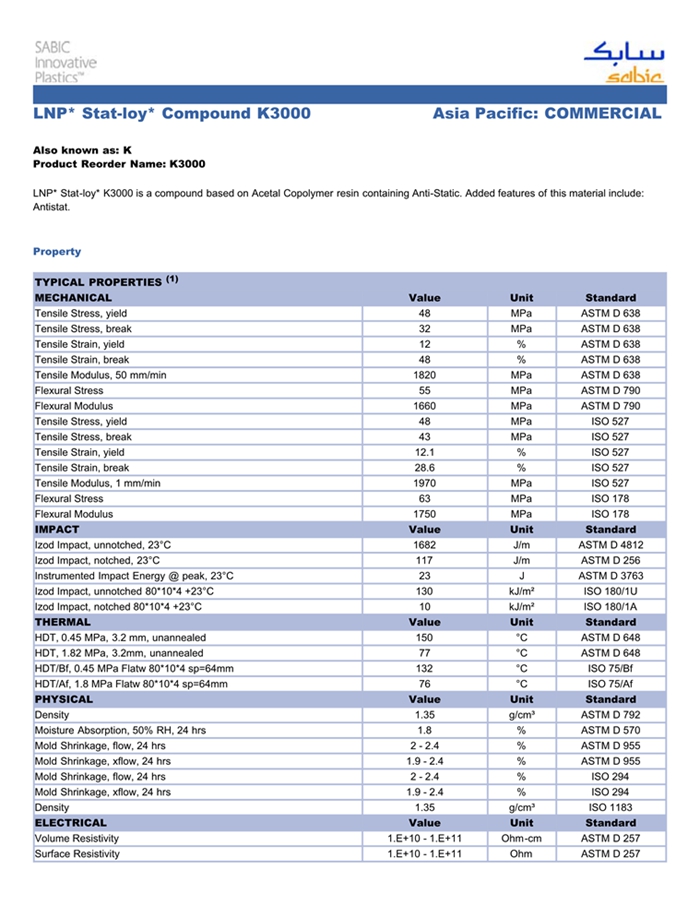 LNP* Stat-loy* K3000 is a compound based on Acetal Copolymer resin containing Anti-Static. Added features of this material include: Antistat.
