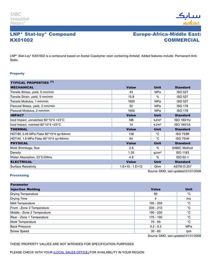应用范围:产品描述LNP STATLOY KX01002物性表LNP STAT-LOY KX01002是一种聚甲醛(POM)共聚物材料,加工方式为:注射成型。LNP STAT-LOY KX01002的主要特性有:通过ROHS认证抗静电