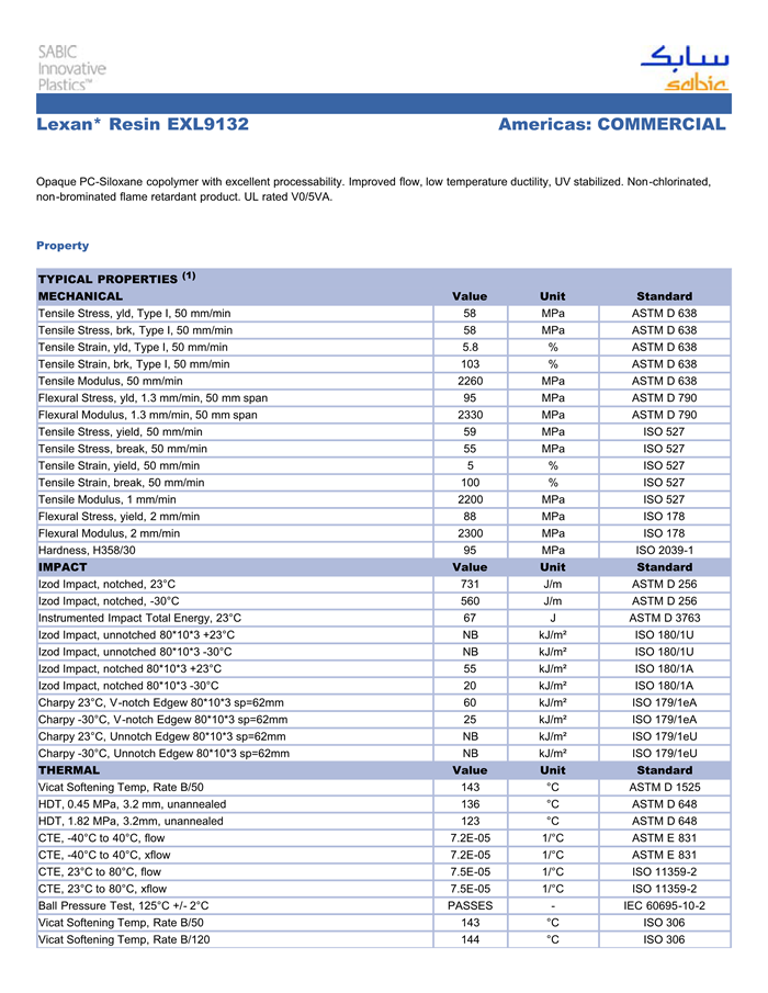 应用范围:产品描述Lexan PC EXL9132物性表“Lexan EXL9132 resin是一种聚碳酸酯(PC)材料,加工方式为:注射成型。主要特性有:阻燃/额定火焰Flame Retardant无卤素共聚物加工性能良好”。相关颜色色号:EXL9132-BK1D621Opaque PC-Siloxane copolymer with excellent processability. Improved