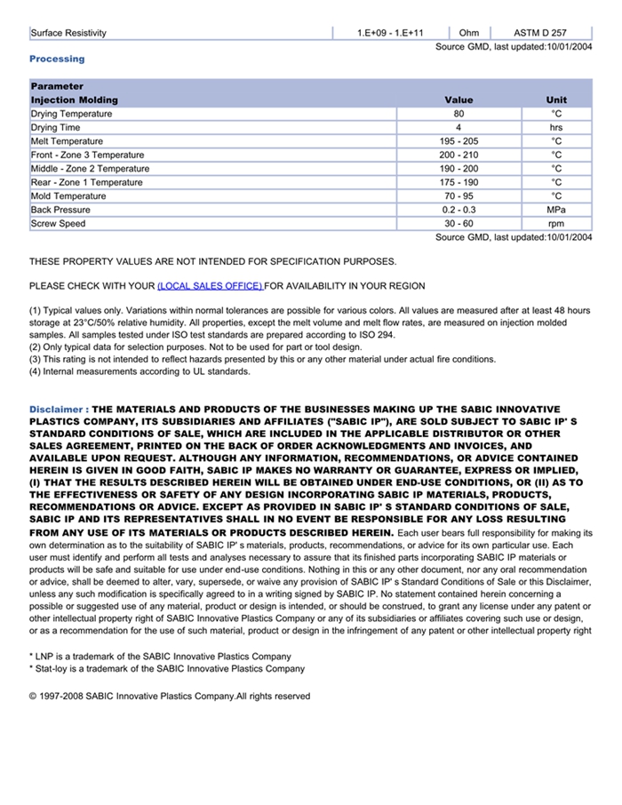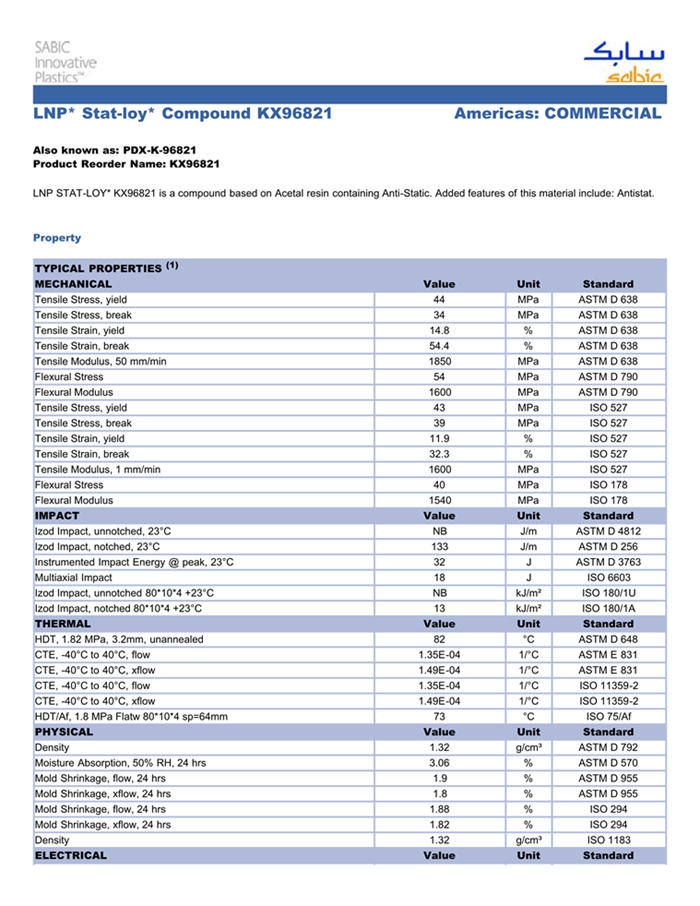 应用范围: 产品描述 LNP Statloy KX96821物性表 “LNP STAT-LOY KX96821是一种聚甲醛(POM)共聚物产品,含有的填充物为专有填料,可以通过注射成型进行加工。 主要特性为:抗静电。” LNP STAT-LOY* KX96821 is a compound based on Acetal resin containing Anti-Static. Added fe