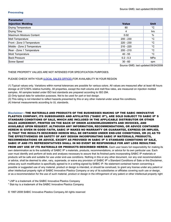 应用范围: 产品描述 LNP STATLOY 9X03508物性表 LNP STAT-LOY 9X03508是一种聚苯醚+PS+尼龙(PPE+PS+尼龙)产品,含有的填充物为专有填料,可以通过注射成型进行加工。 特性包括: Flame Retardant 抗静电 耐冲击