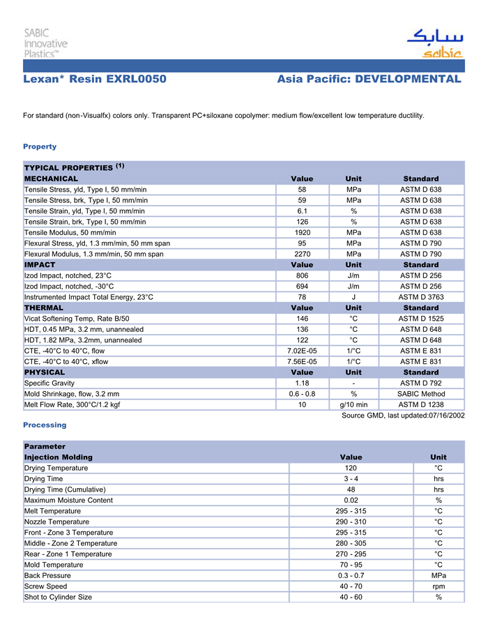 应用范围:产品描述LEXAN PC EXRL0050物性表For standard (non-Visualfx) colors only. Transparent PC+siloxane copolymer: medium flow/excellent low temperature ductility.