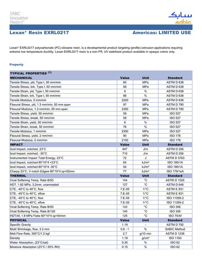 Lexan* EXRL0217 polycarbonate (PC) siloxane resin, is a developmental product targeting (profile) extrusion applications requiring extreme low temperature ductility. Lexan EXRL0217 resin is a non-FR, UV stabilized product available in opaque colors only.