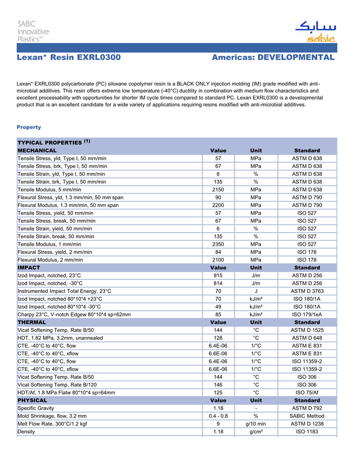 应用范围:产品描述LEXAN PC EXRL0300物性表Lexan* EXRL0300 polycarbonate (PC) siloxane copolymer resin is a BLACK ONLY injection molding (IM) grade modified with anti-microbial additives. This resin offers extreme low t