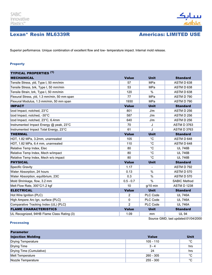 LEXAN PC ML6339R物性表