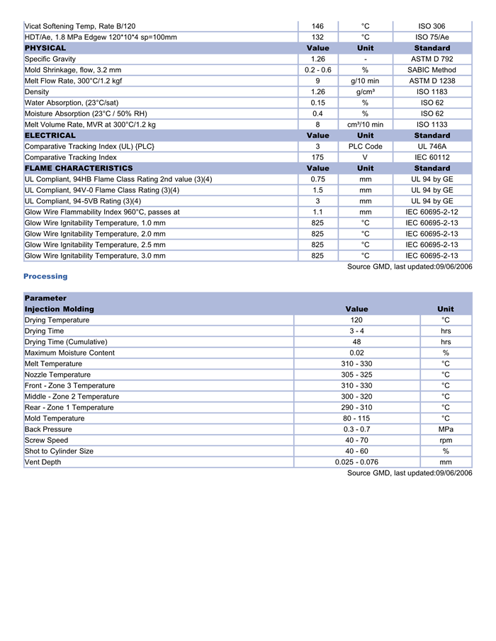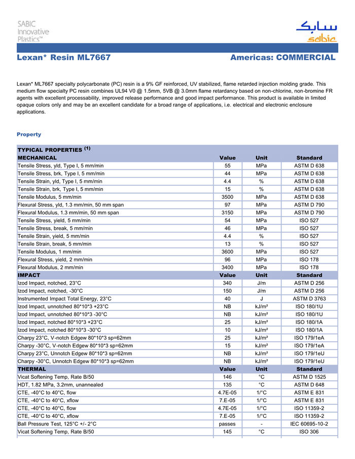 Lexan* ML7667 specialty polycarbonate (PC) resin is a 9% GF reinforced, UV stabilized, flame retarded injection molding grade. This medium flow specialty PC resin combines UL94 V0 @ 1.5mm, 5VB @ 3.0mm flame retardancy based on non-chlorine, non-bromine FR agents with excellent processability, improved release performance and good impact performance. This product is available in limited opaque colors only and may be an excellent candidate for a broad range of applications, i.e. electrical and electronic enclosure applications.