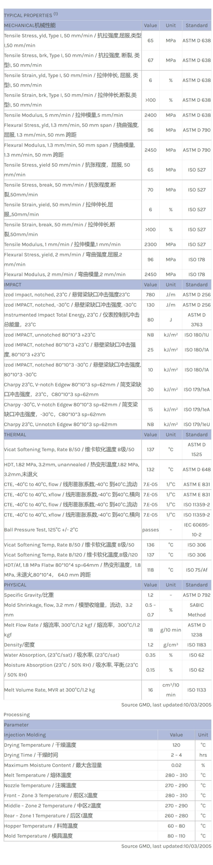 应用范围:产品描述LEXAN PC SLX1231D物性表Low viscosity PC copolymer blend with enhanced UV stabilization and added release agent. Available in diffusion colors.
