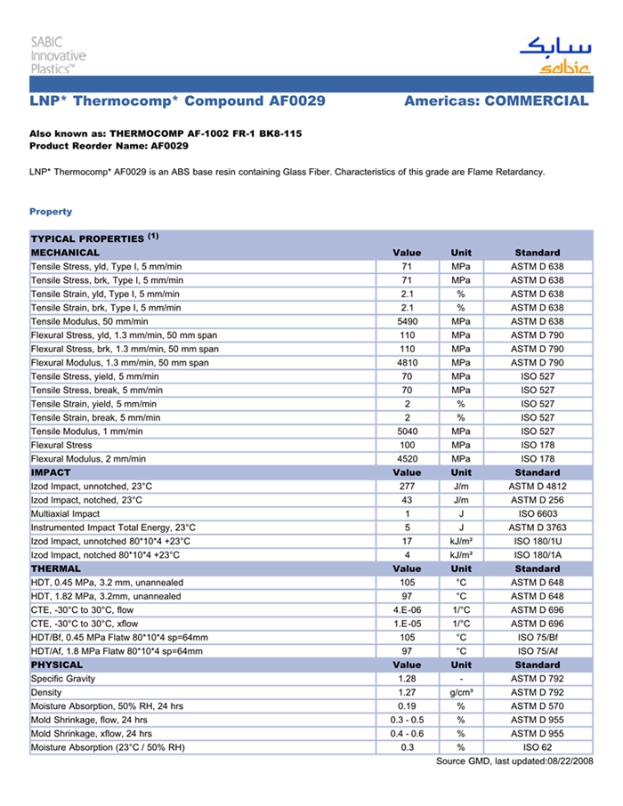 应用范围: 产品描述 LNP THERMOCOMP AF0029物性表 LNP THERMOCOMP AF0029是一种丙烯腈丁二烯苯乙烯(ABS)产品,含有的填充物为玻璃纤维增强材料,可以通过注射成型进行加工。