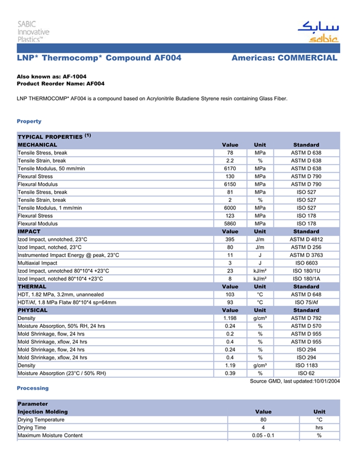 应用范围: 产品描述 LNP Thermocomp AF004物性表 “LNP THERMOCOMP AF004是一种丙烯腈丁二烯苯乙烯(ABS)产品,含有的填充物为20%玻璃纤维增强材料,可以通过注射成型进行加工。 典型应用领域为:汽车行业。 主要特性为:阻燃/额定火焰。” LNP THERMOCOMP* AF004 is a compound based on Acrylonitrile B