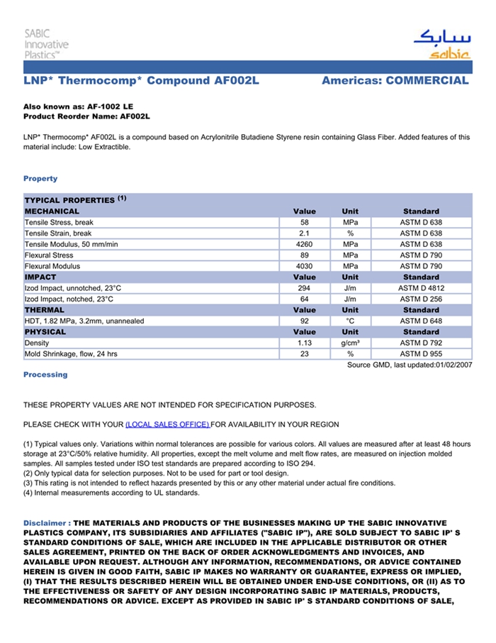 应用范围:产品描述LNP THERMOCOMP AFB42物性表LNP* Thermocomp* AF-1006 MG is a compound based on ABS containing mixed glass.