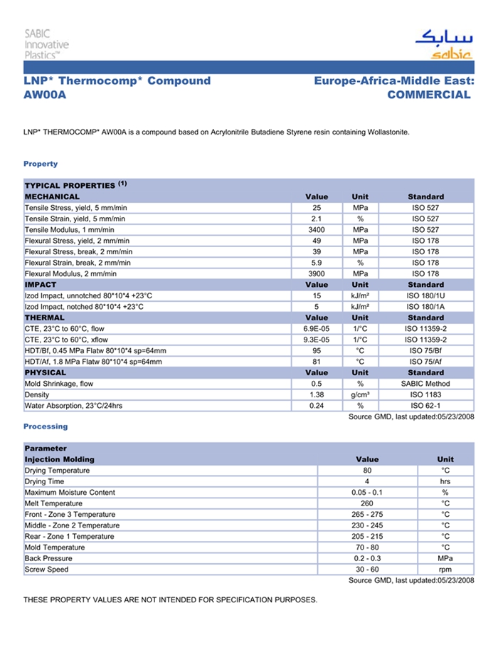 应用范围: 产品描述 LNP THERMOCOMP AW00A物性表 LNP THERMOCOMP* AW00A is a compound based on Acrylonitrile Butadiene Styrene resin containing Glass Fiber.