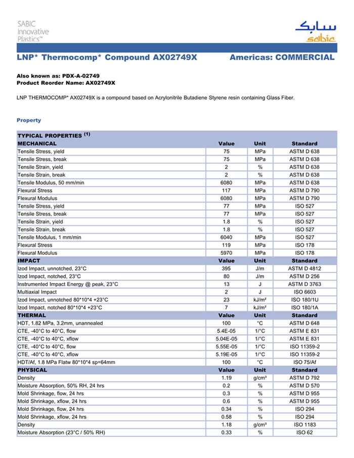应用范围: 产品描述 LNP THERMOCOMP AX02749X物性表 LNP THERMOCOMP* AX02749X is a compound based on Acrylonitrile Butadiene Styrene resin containing Glass Fiber.
