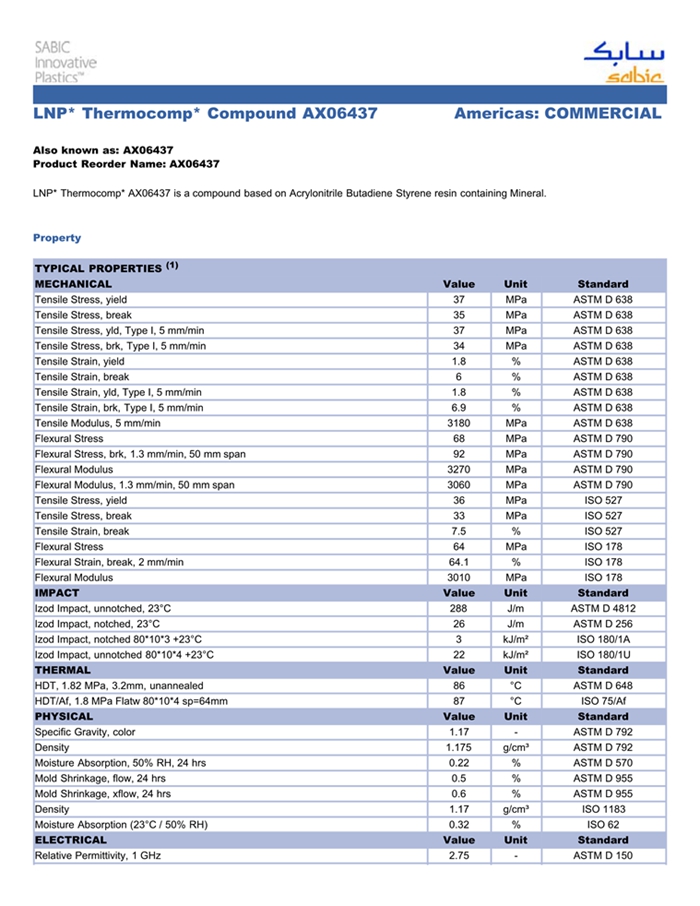 应用范围: 产品描述 LNP Thermocomp AX06437物性表 LNP THERMOCOMP AX06437是一种丙烯腈丁二烯苯乙烯(ABS)产品,含有的填充物为专有填料,可以通过注射成型进行加工。 相关颜色色号:AX06437-NT LNP* Thermocomp* AX06437 is a compound based on Acrylonitrile Butadiene Styre