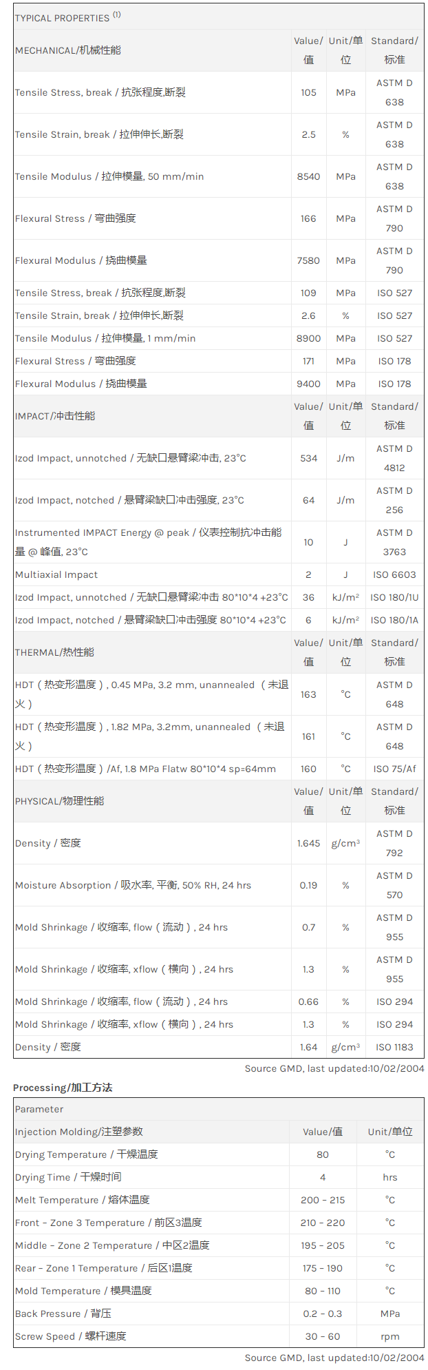 应用范围: 产品描述 LNP Thermocomp KFZ24XXP物性表 “LNP THERMOCOMP KFZ24XXP是一种聚甲醛(POM)共聚物产品,含有的填充物为20%玻璃纤维增强材料和10%带压花的玻璃纤维,可以通过注射成型进行加工货。 特性包括: 化学耦合 抗翘曲 润滑” LNP THERMOCOMP* KFZ24XXP is a compound based on Aceta