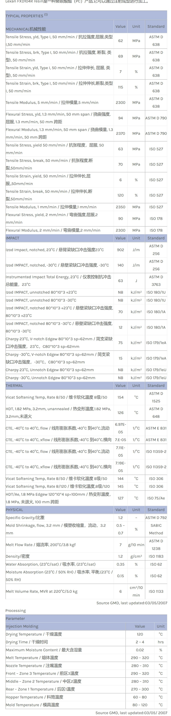 Lexan FXD104R resin是一种聚碳酸酯(PC)产品,它可以通过注射成型进行加工