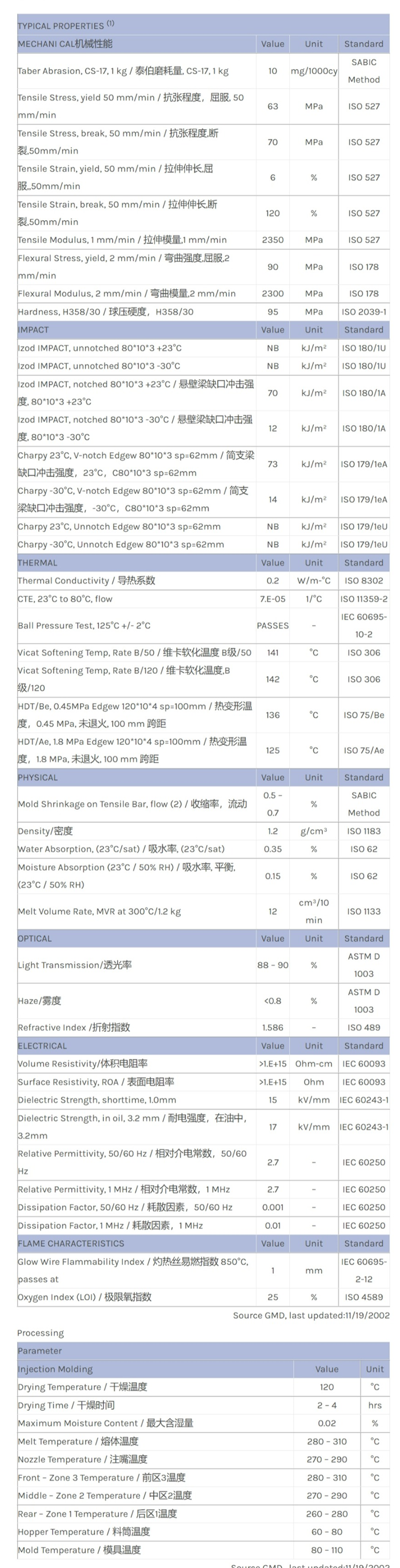 应用范围: 产品描述 LEXAN PC LS2K物性表 LEXAN LS2K is a medium viscosity grade especially designed for applications with high optical requirements in terms of clarity and Light Transmission/透光率.