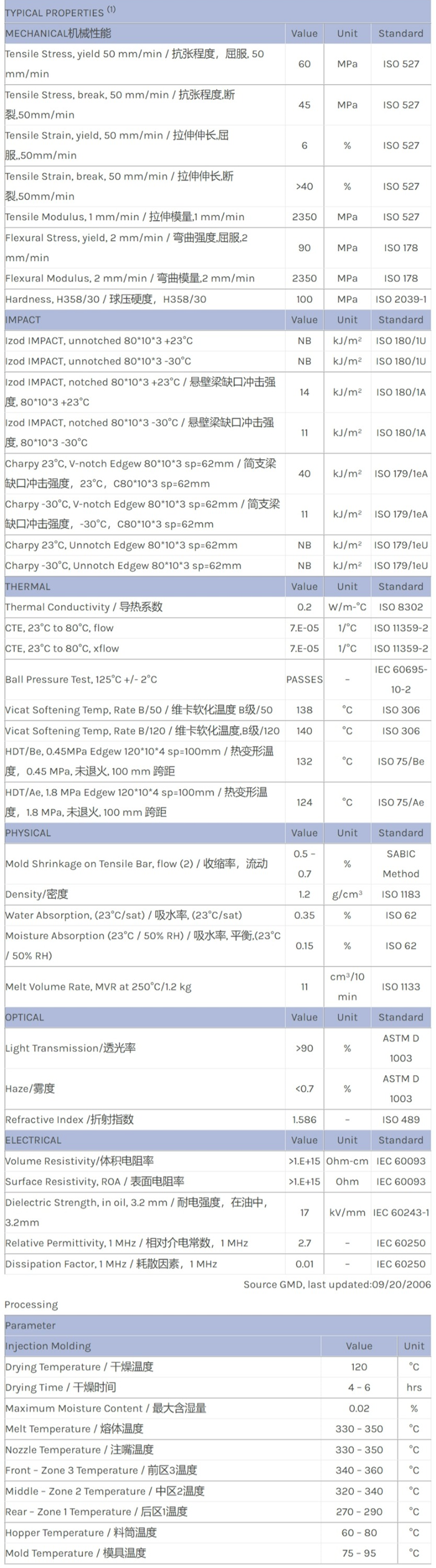 应用范围: 产品描述 LEXAN PC OQ1026物性表 LEXAN OQ1026 is an optical quality, high purity PC resin optimized for the demanding short cycle times used in DVD production. Advances in technology further enhanced the p