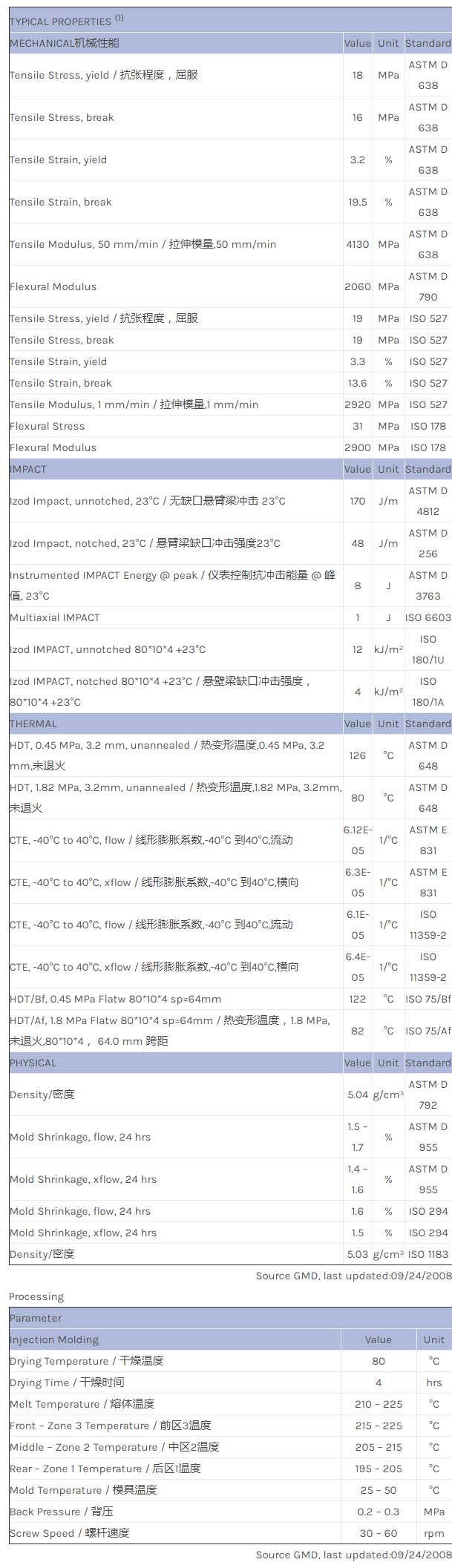 应用范围: 产品描述 LNP THERMOCOMP MH0500C物性表 LNP* Thermocomp* MH0500C is a compound based on Polypropylene resin containing High Specific Gravity/比重 Filler. Added features of this material include: High Specifi