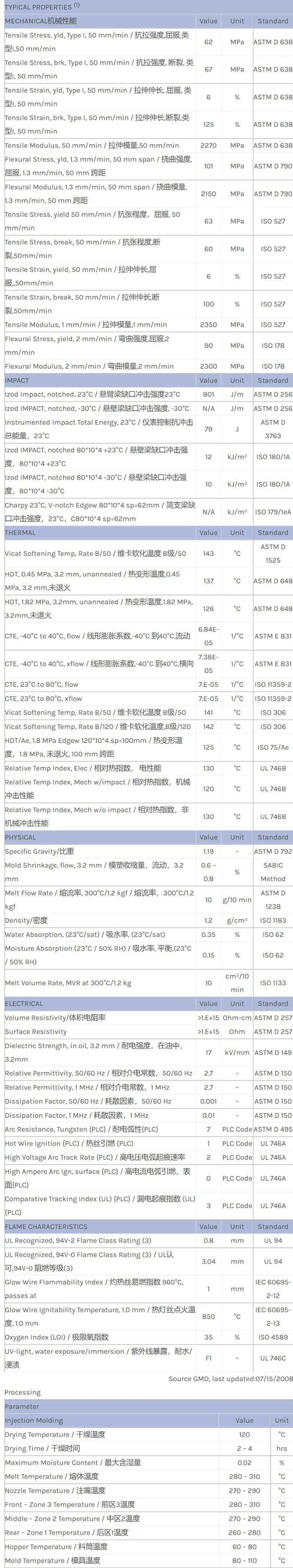 应用范围: 产品描述 LEXAN PC 949AU物性表 Lexan* 949AU Polycarbonate (PC) resin is a non-filled, injection moldable grade. This halogen-free flame retardant PC has an UL-94 V0 rating and Melt Flow Rate / 熔流率 (MFR) o