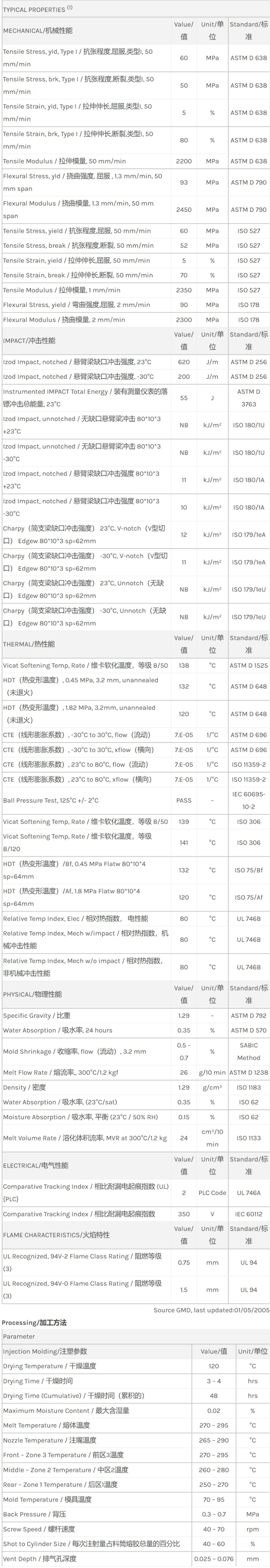 应用范围: 产品描述 Lexan PC BFL2000U物性表 “Lexan BFL2000U resin是一种聚碳酸酯(PC)产品。它可以通过注射成型进行处理,且可以在北美洲中获得。 特性包括: 阻燃/额定火焰 无卤素”。 相关颜色色号:BFL2000U-WH3150、BFL2000U-WH9G235 Lexan* BFL2000U Polycarbonat (PC) resin is a