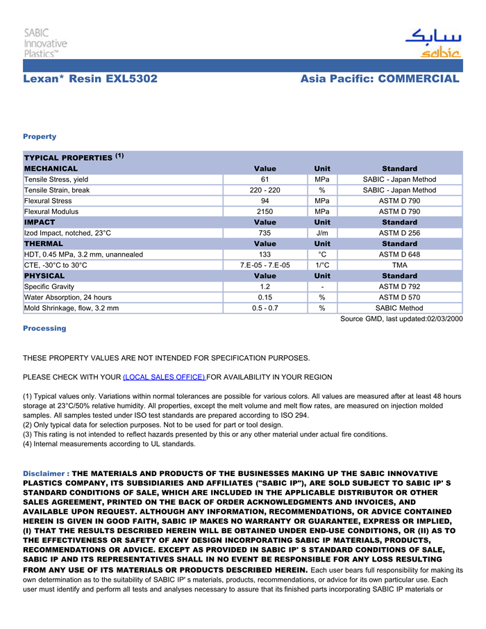应用范围: 产品描述 LEXAN PC EXL5302物性表