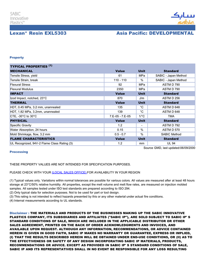 应用范围: 产品描述 LEXAN PC EXL5303物性表