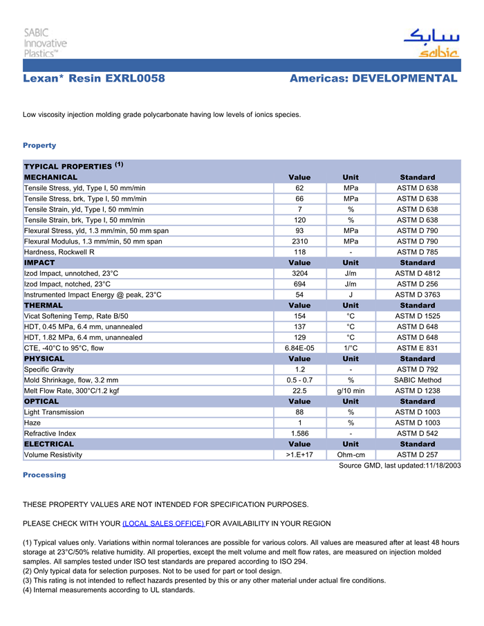 应用范围: 产品描述 LEXAN PC EXRL0058物性表 Low viscosity injection molding grade polycarbonate having low levels of ionics species.