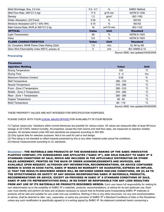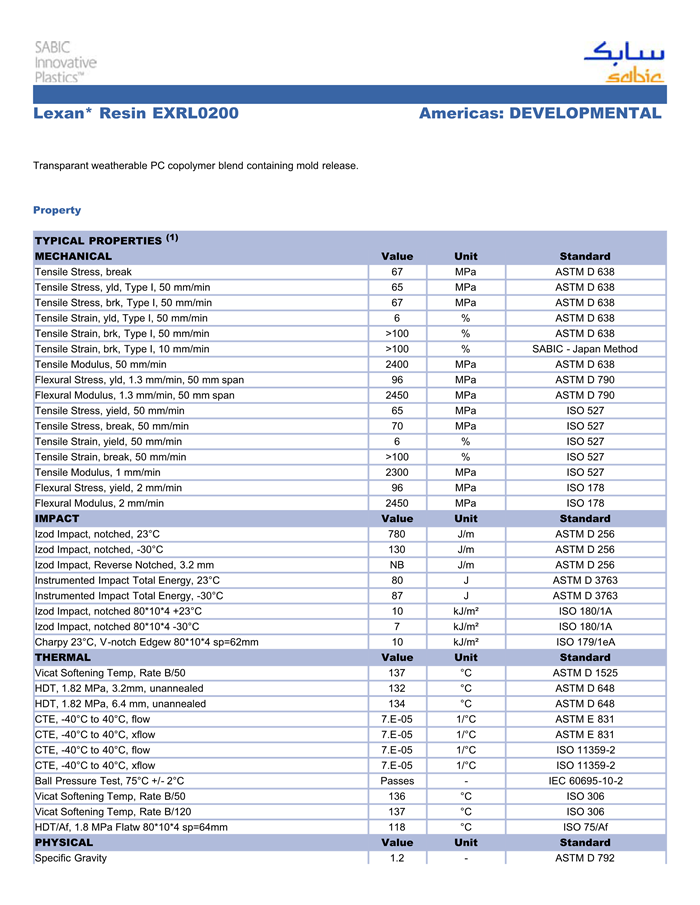 应用范围: 产品描述 LEXAN PC EXRL0200物性表 Transparant weatherable PC copolymer blend containing mold release.