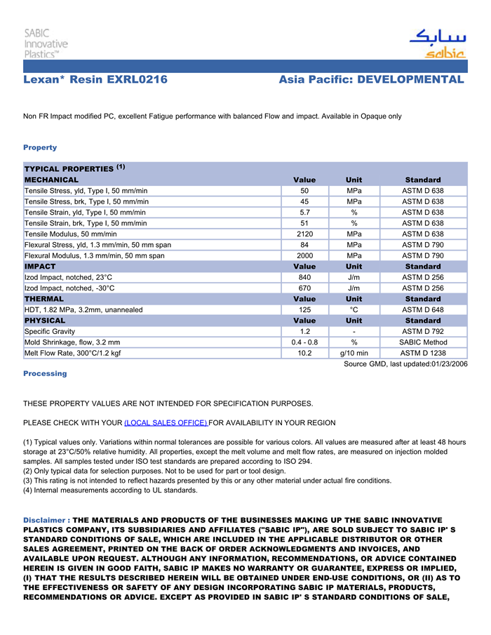 应用范围: 产品描述 LEXAN PC EXRL0216物性表 Non FR IMPACT modified PC, excellent Fatigue performance with balanced Flow and IMPACT. Available in Opaque only
