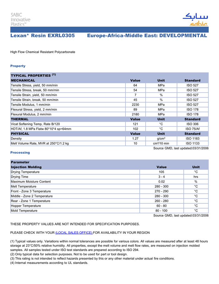 应用范围: 产品描述 LEXAN PC EXRL0305物性表 High Flow Chemical Resistant Polycarbonate