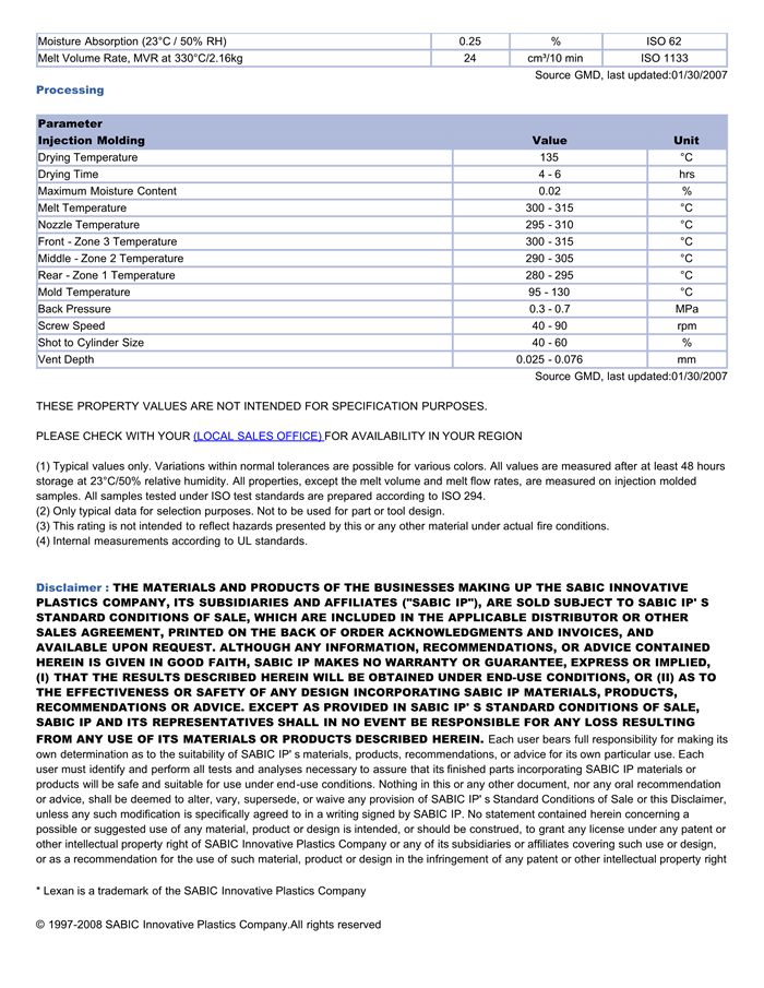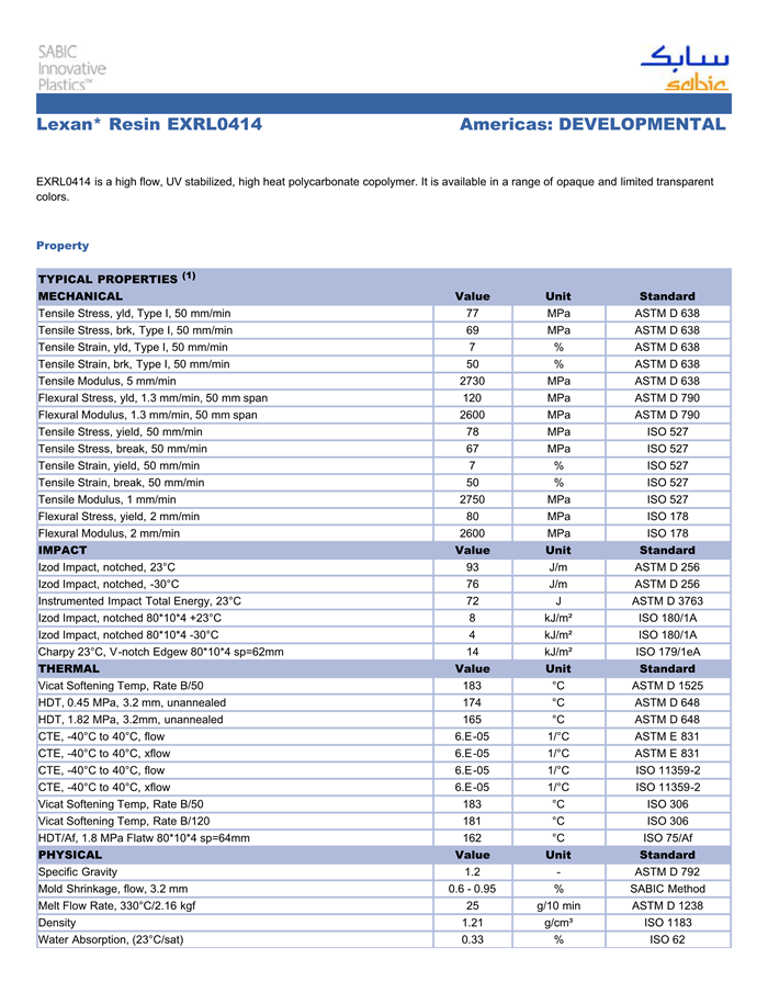 应用范围: 产品描述 LEXAN PC EXRL0414物性表 EXRL0414 is a high flow, UV stabilized, high heat polycarbonate copolymer. It is available in a range of opaque and limited transparent colors.