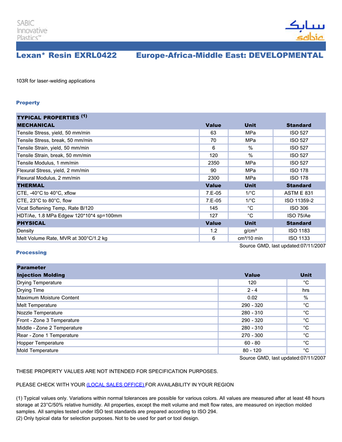 应用范围: 产品描述 LEXAN PC EXRL0422物性表 103R for laser-welding applications