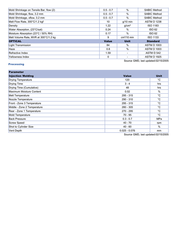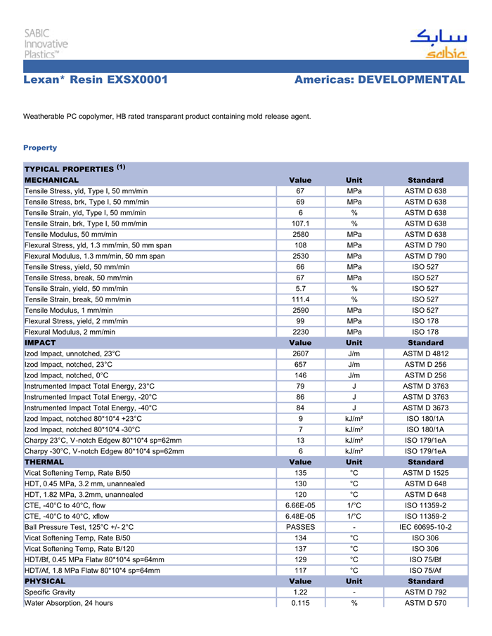 应用范围: 产品描述 LEXAN PC EXSX0001物性表 Weatherable PC copolymer, HB rated transparant product containing mold release agent.