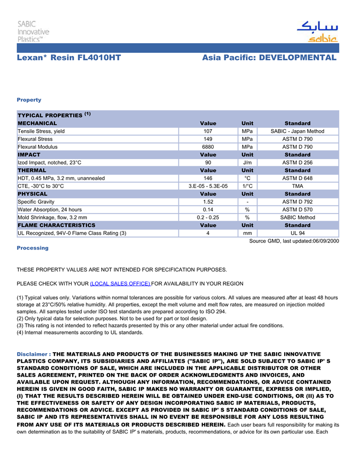 应用范围: 产品描述 LEXAN PC FL4010HT物性表