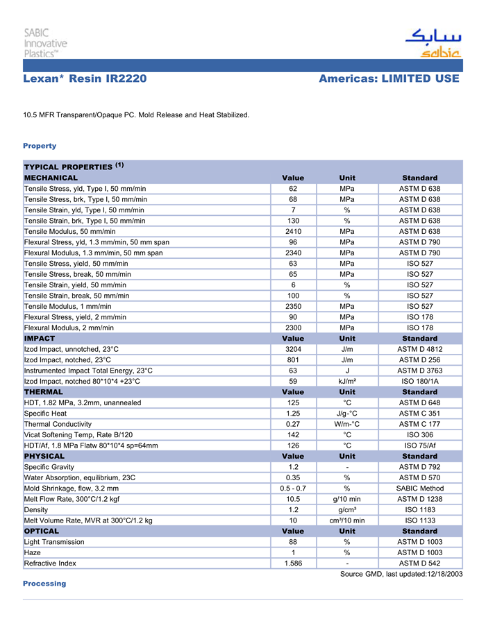 应用范围: LEXAN PC IR2220物性表 10.5 MFR Transparent/Opaque PC. Mold Release and Heat Stabilized. 产品描述
